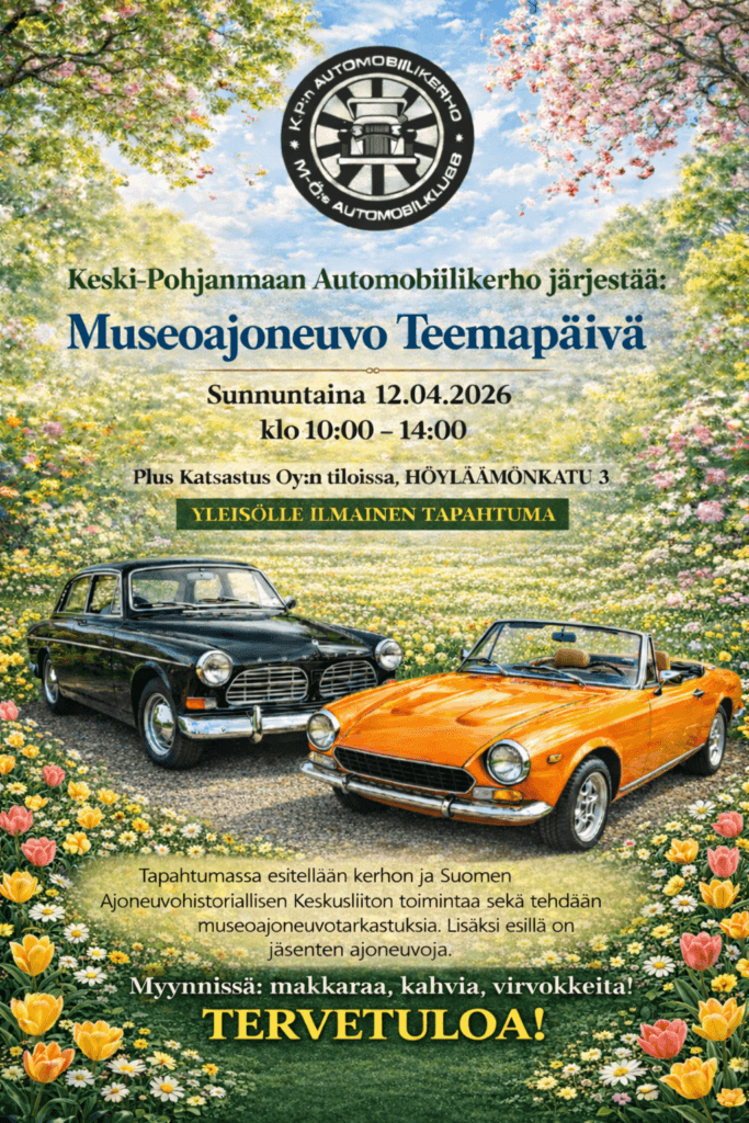 Museoajoneuvo teemapäivä Plus Katsastuksen tiloissaMilloin 12.04.2026 10.00 - 14.00 Add To Calendar Download ICS Google Calendar iCalendar Office 365 Outlook LiveMissä Plus Katsastus Kokkola Höyläämönkatu 3, Kokkola, 67100